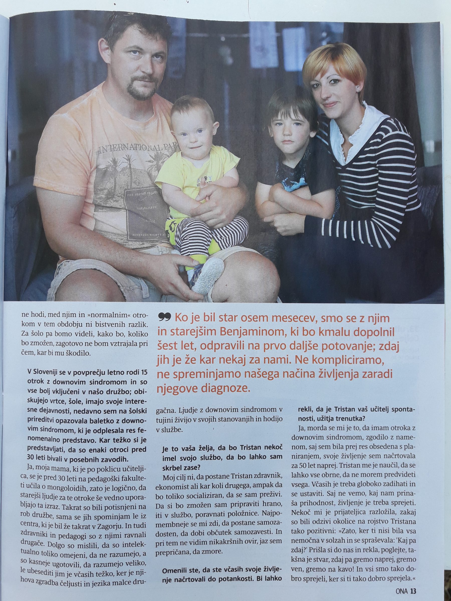 V reviji Onaplus je bil v začetku julija objavljen intervju z Nežo Šabanovič Grmšek, mamico Tristana, ki je brezpogojno sprejet in ljubljen. Kljub “odvečnemu” kromosomu.